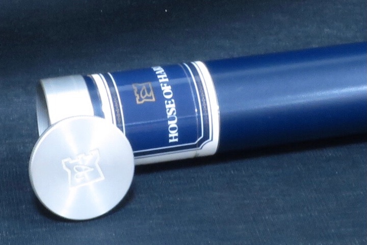 ブルーに塗られたケース。蓋には刻印あり。
