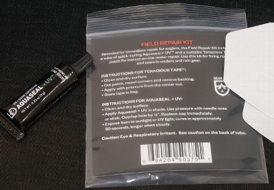 Waderなどの補修に角形のパッチが二枚釣り場での補修を可能とするため、UV紫外線で硬化するアクアシール付属。